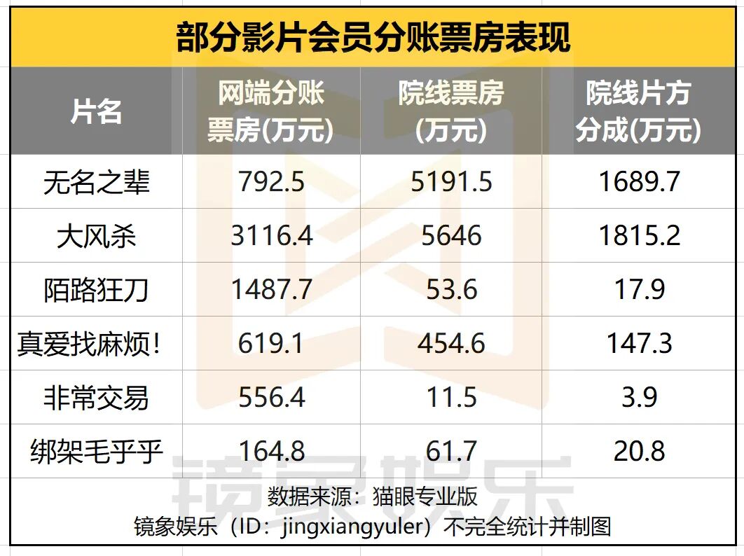 随后在6月18日,《大风杀》转向网端二次发行。和之前更常见的点播模式不同,在会员分账模式下,院线电影在网端获取收益取决于会员拉新、会员观看时长等数据,并不需要观众额外付费。截至目前,《大风杀》虽还在分账期,但累计分账额已经达到3116.4万元,是片方院线分成的两倍还多。