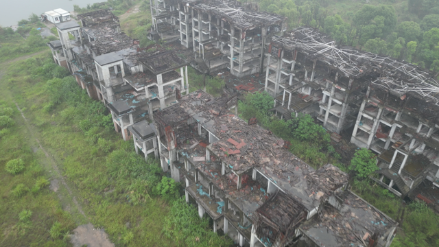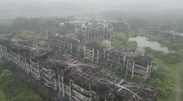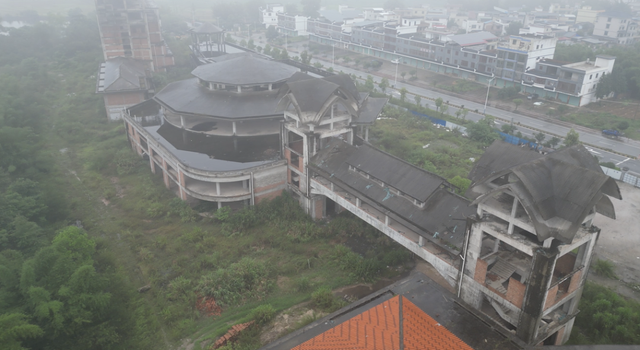 时间倒回2013年,这个由旅行社跨界打造的旅游地产项目一度承载着许多期待。占地200多亩,规划16栋建筑,试图借珠玑古巷的人气打造配套景区。可惜好景不长,2015年工程戛然而止,一停便是近10年。野草渐渐吞没道路,工棚隐入藤蔓,只剩下寂静的混凝土躯壳在风雨中不断锈蚀。