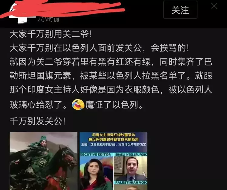 这一切都始于海外华人在社交平台上发布关羽的照片。照片中的红脸、绿斗篷、黑胡子,实际上成了以色列网友眼中暗示“支持巴勒斯坦”的禁忌符号。