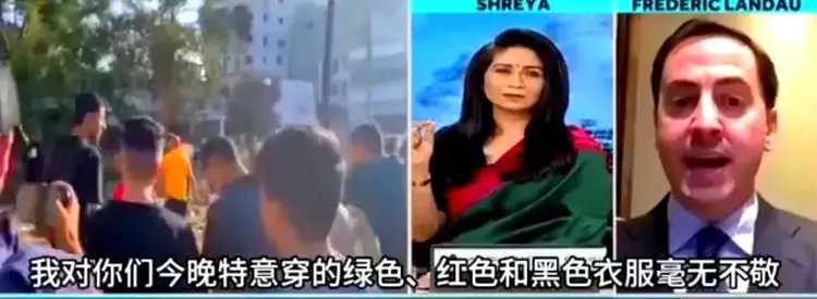 这位身穿传统红绿纱丽的男评论员突然失控,大声质问她为什么穿这样一件“支持巴勒斯坦”的衣服。他甚至吹嘘以色列国旗是“蓝白相间”,一定会获胜。女主持人服饰上的“绿、红、黑”。