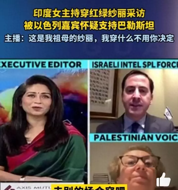 10月下旬,印度女主持人被以色列“玻璃心”客人指责穿着祖母的纱丽接受采访。配色为绿、红、黑,与巴勒斯坦国旗的颜色几乎相同。 [浮云][微风]