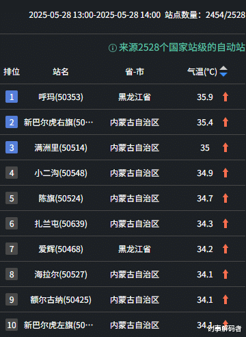 5月28日,中国天气网实时气温排行榜上出现震撼一幕——黑龙江呼玛(36.5℃)、内蒙古满洲里(35℃),这些以往冬天动辄40℃的"极寒地区",竟然超越海南三亚(30℃)、广州(28℃),成为全国最热的地方!