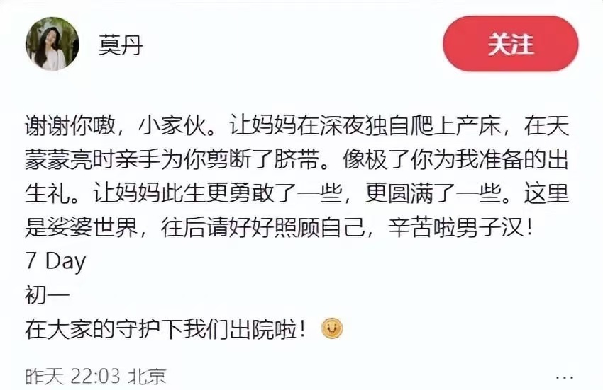 莫丹的发文揭示了生产过程中的不易与勇敢。她是顺产,且是在深夜发动。