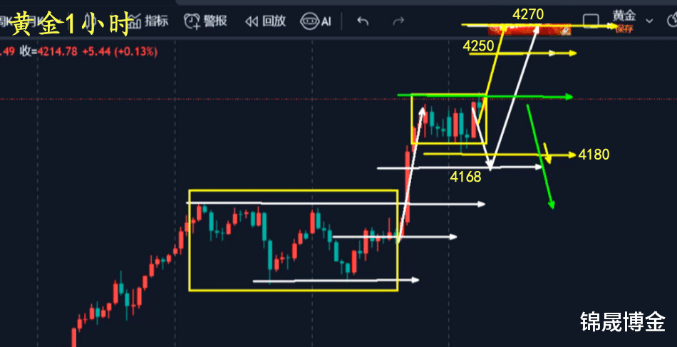 那么在强势行情中,高位横盘也是修正的一种,在午后2—3点可以直接去看北上,继续的去看欧盘上升破高,不用再等4168—4169这个支撑位置,压力还是一样4250—4270!