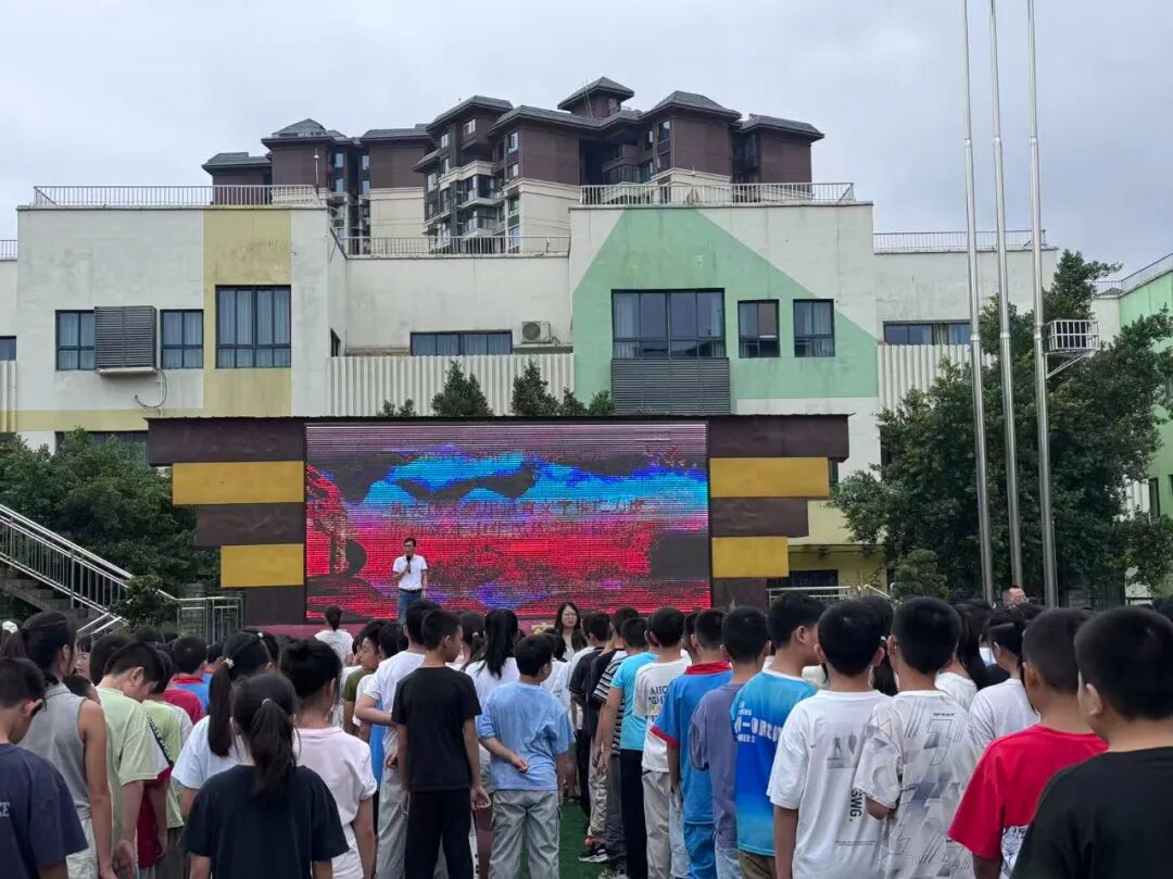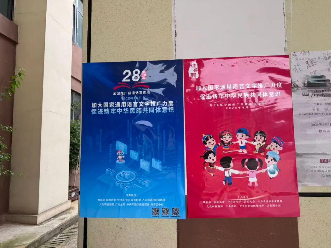 为让推普氛围无处不在,学校提前统筹规划,在校园关键区域布设宣传阵地。校门口的电子屏滚动播放“加大国家通用语言文字推广力度,促进铸牢中华民族共同体意识”等核心主题标语;公共区域张贴宣传海报等。随处可见的宣传标语,以直观鲜明的方式强化视觉引导,让师生在耳濡目染中深化规范用语用字的自觉意识。