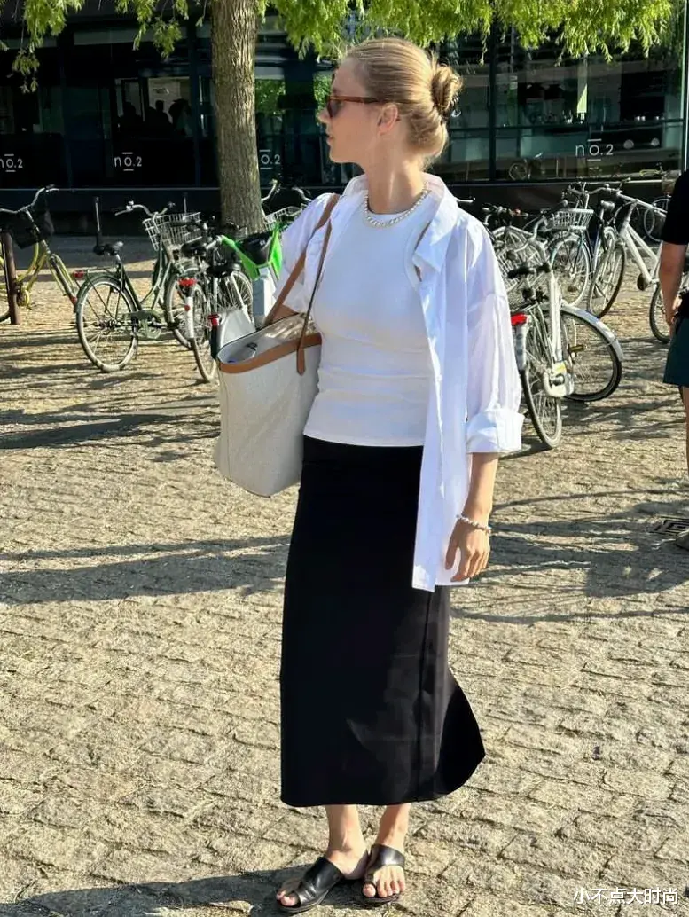 白色衬衫自带少年感的洒脱,搭配黑色的高腰直筒裙,干干净净,显高又显瘦。裙子的优雅气质搭配衬衫的随性利落,让穿搭简约显气质,干净又有高级感。▼