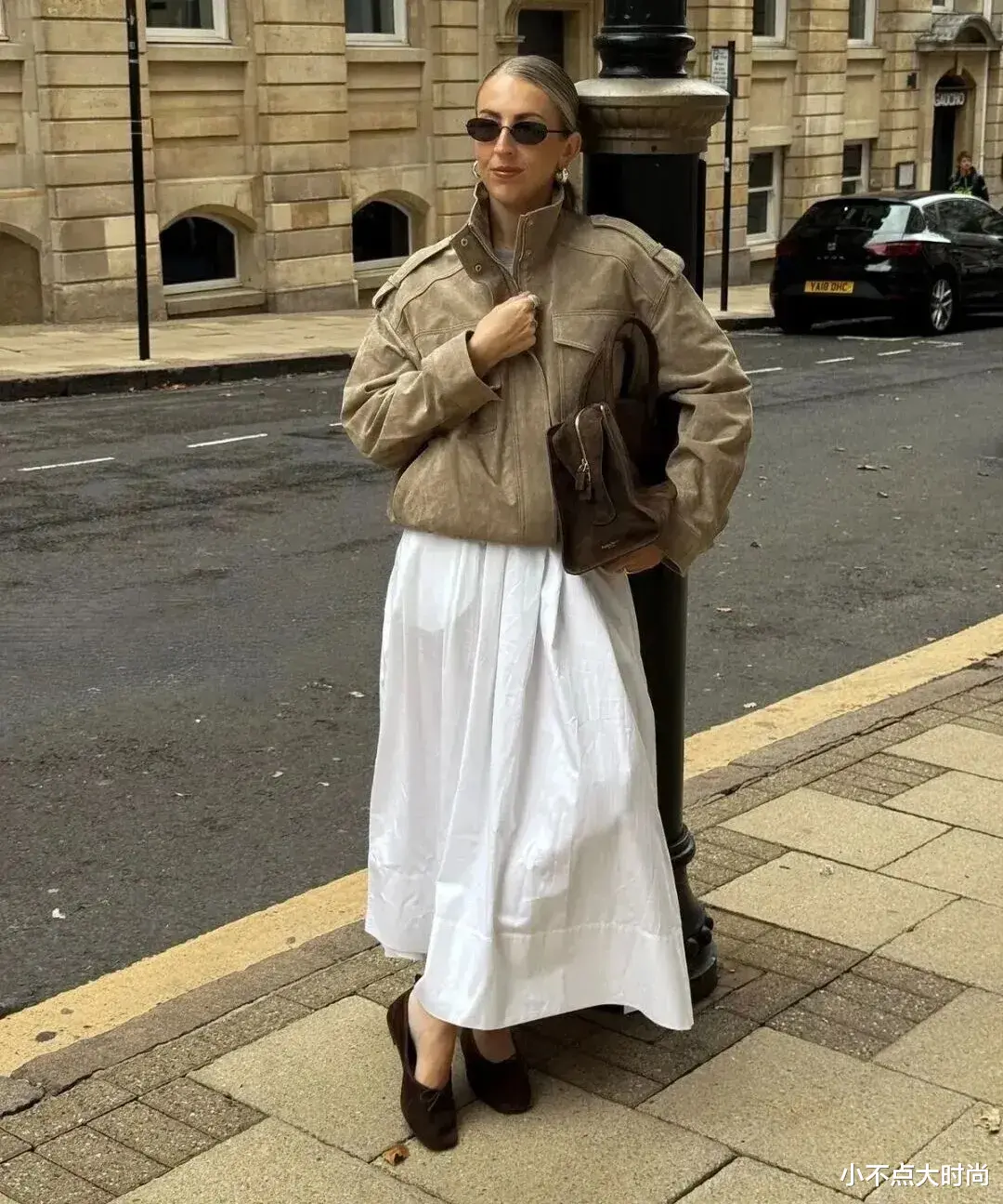 点点强烈建议身高不到155cm的矮个子姐妹,今年秋天裙子一定要学会“刚柔对搭”,不仅能增添利落感来更显高,还能中和裙子的柔美,注入一丝力量感,让整套搭配又柔又飒,妥妥的大女主气质和高级感。