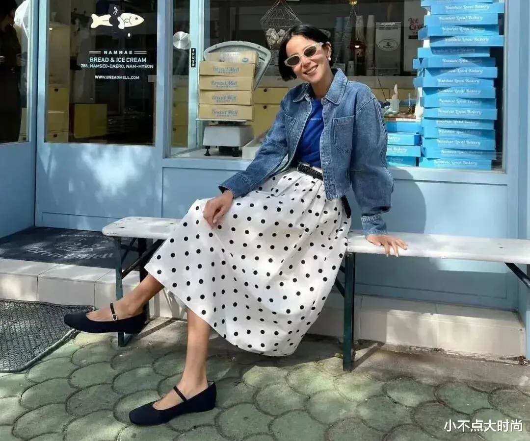 短款的牛仔外套搭配波点高腰半身裙,上短下长,自然打造高腰线,很适合小个子,显高又显瘦。牛仔外套的休闲和不羁,搭配裙子的浪漫和趣味,让穿搭尽显时尚感,优雅又有辨识度。▼
