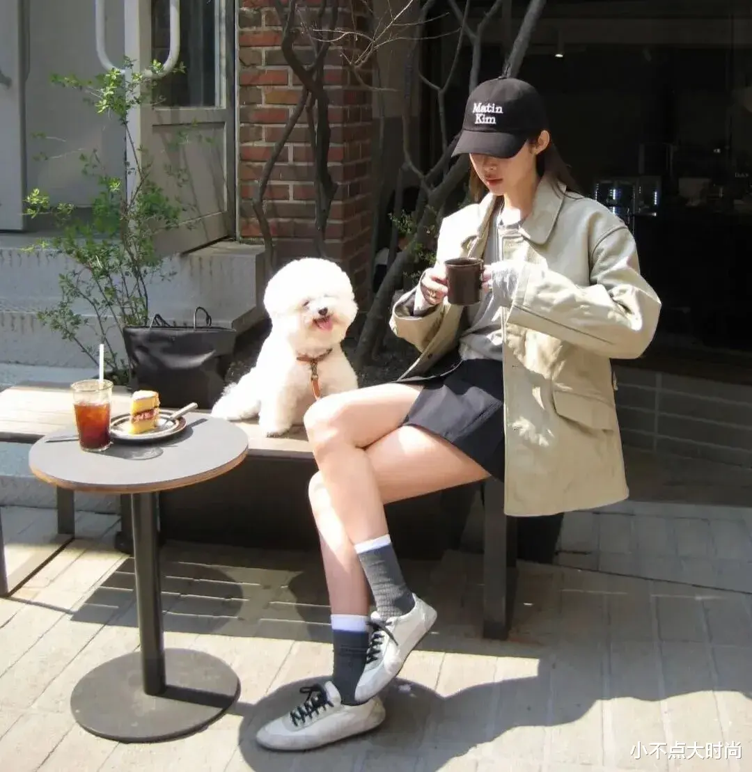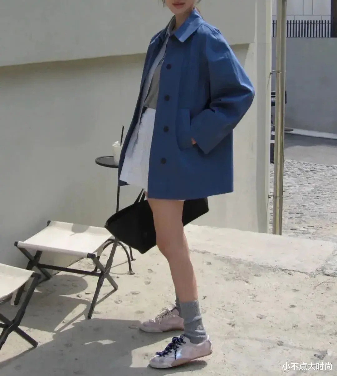蓝色的风衣外套很适合小个子秋天穿,清新又飒爽,内搭白色的高腰短裙和灰色衬衫,减龄又文艺的气质穿搭,既有风衣的洒脱又有裙子的柔美,清爽好气质。▼