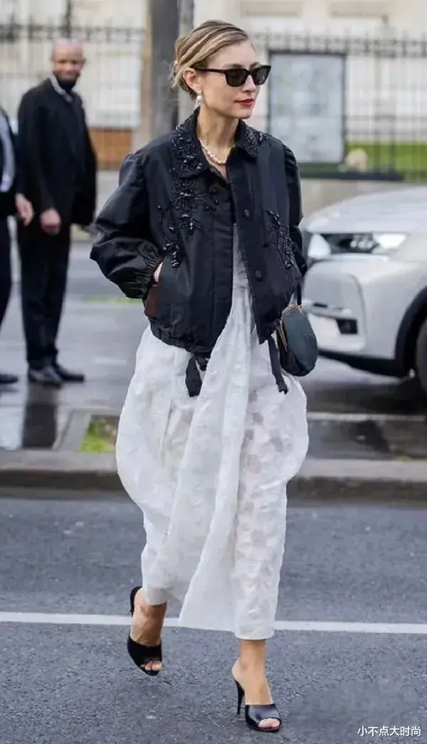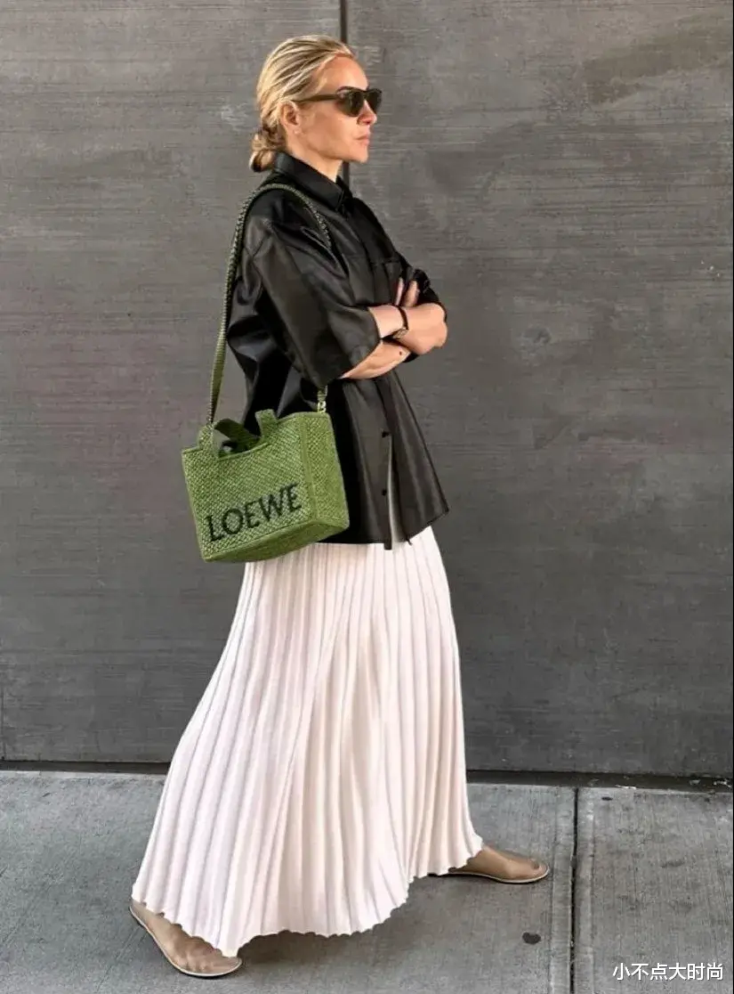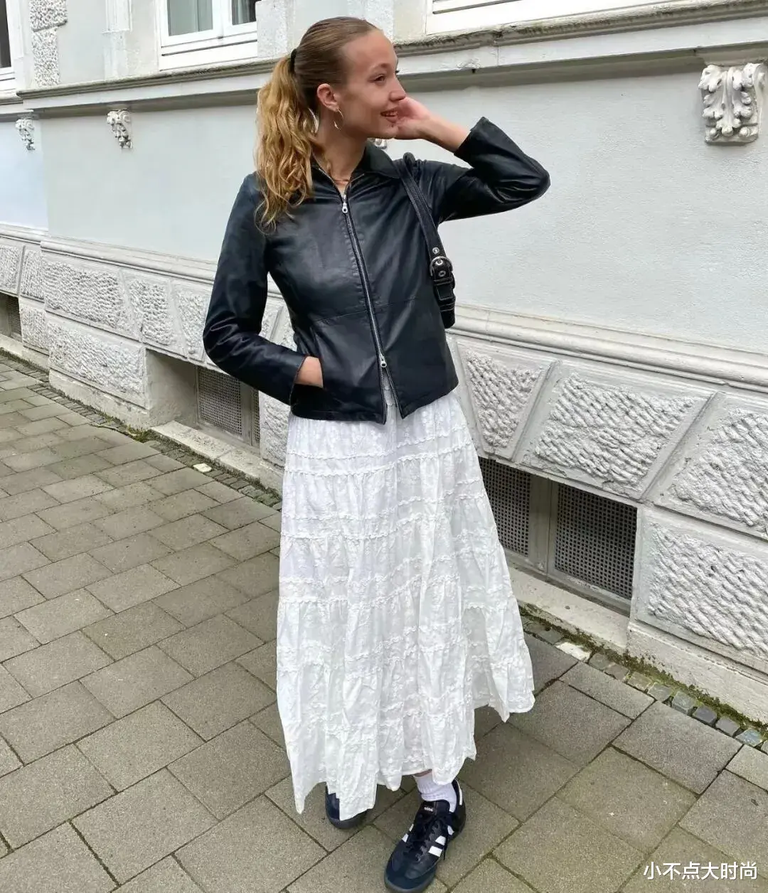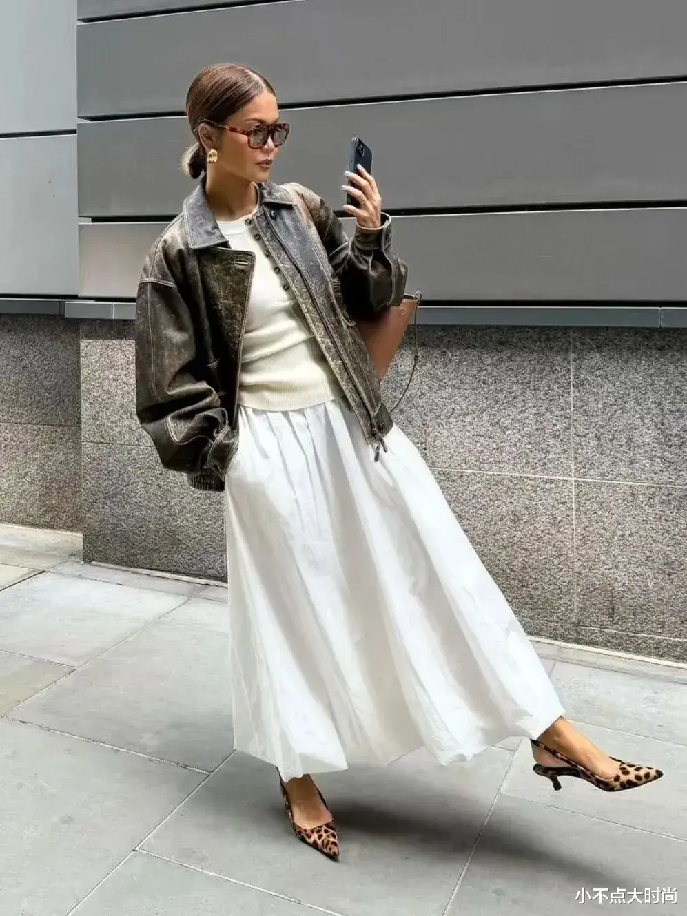 比如一件帅气的复古皮衣,搭配柔美浪漫的白色长裙,色彩上的深浅对搭、风格上的硬柔碰撞,穿出了又美又飒的气场和气质来。▼