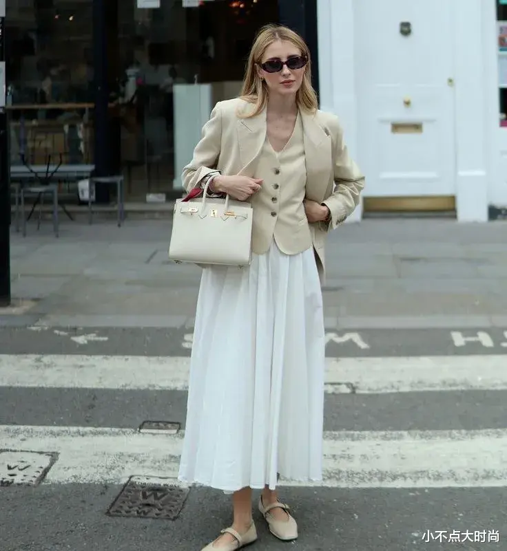 米杏色的西装外套内搭同款西装马甲,利落又飒爽,搭配一条白色的浪漫长裙,提高腰线显高显瘦,是自信又优雅的职场女主范,既能温柔美丽还能帅气开会,是妥妥的现代有力量感的独立女性标配。▼