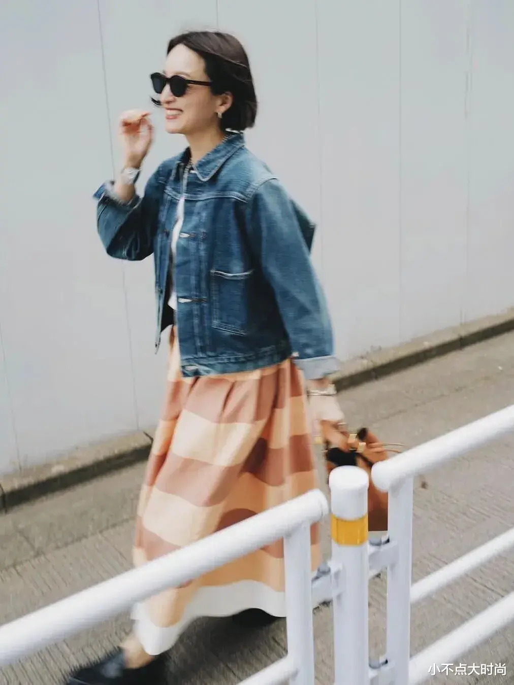 牛仔外套也是帅气的刚毅单品,秋天用来搭配浪漫的裙子,也是经典又气质。牛仔的洒脱碰撞裙子的浪漫热情,整套穿搭飒美十足,洋溢着秋天的氛围和活力。▼