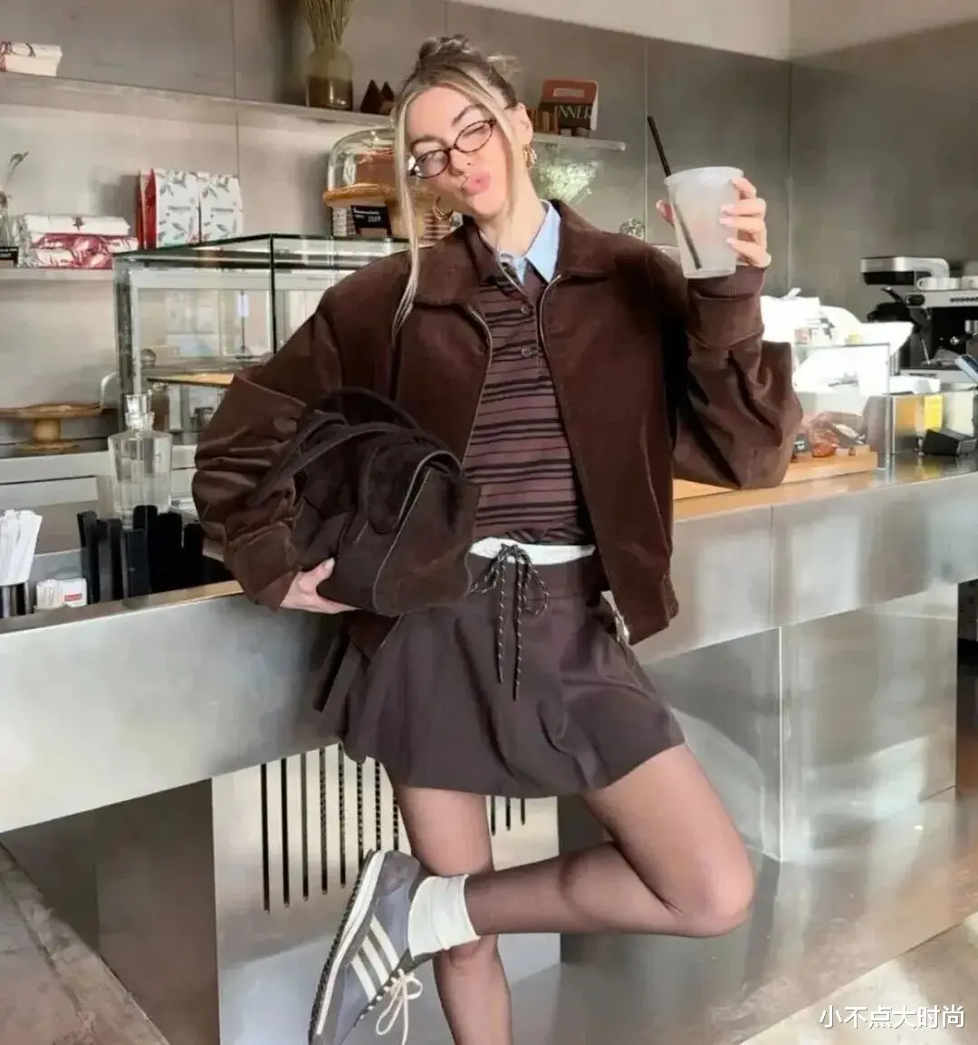棕色翻领的夹克外套,搭配同色系的高腰短裙,内搭棕色条纹的polo衫。高腰短裙显腿长,小个子穿很显高,整套搭配有美式复古的时尚感,又飒爽又辣美,还有几分复古格调,太美了!▼