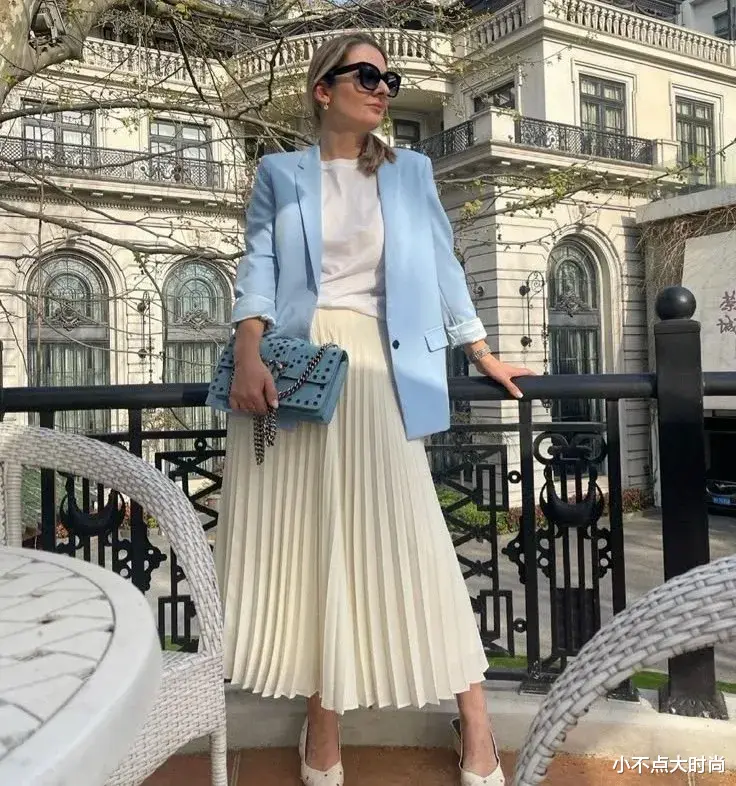 浅色的百褶长裙,干净又优雅,搭配浅蓝色的西装外套,裙子的柔美减轻了西装的严肃感,增添了灵动和气质,让整套搭配飒柔结合,知性大方。▼