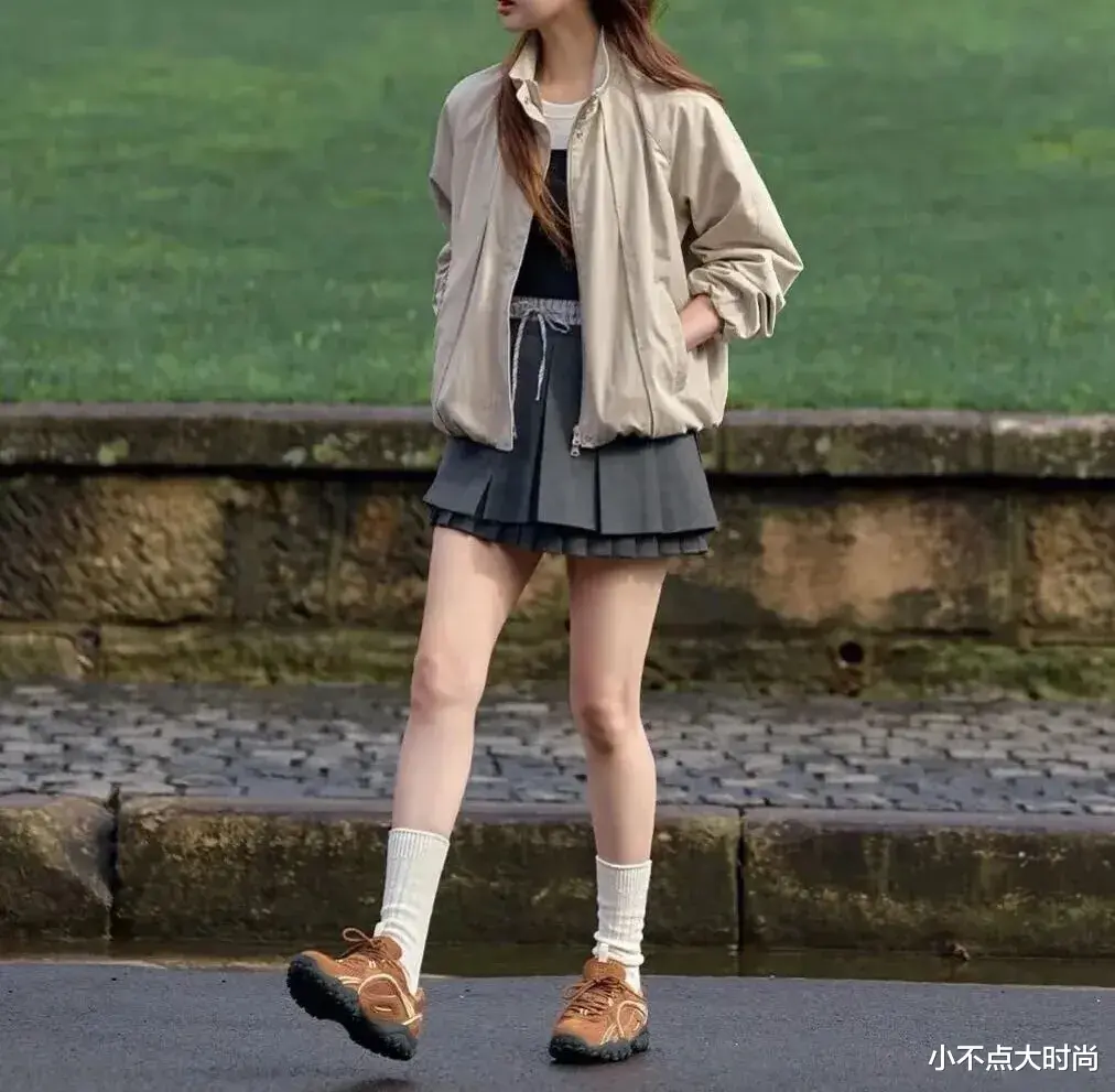 浅卡其色的休闲外套,搭配灰色的高腰百褶短裙,随性又减龄的一套穿搭,显高显瘦,活力甜美又飒爽大方,时尚十足。▼