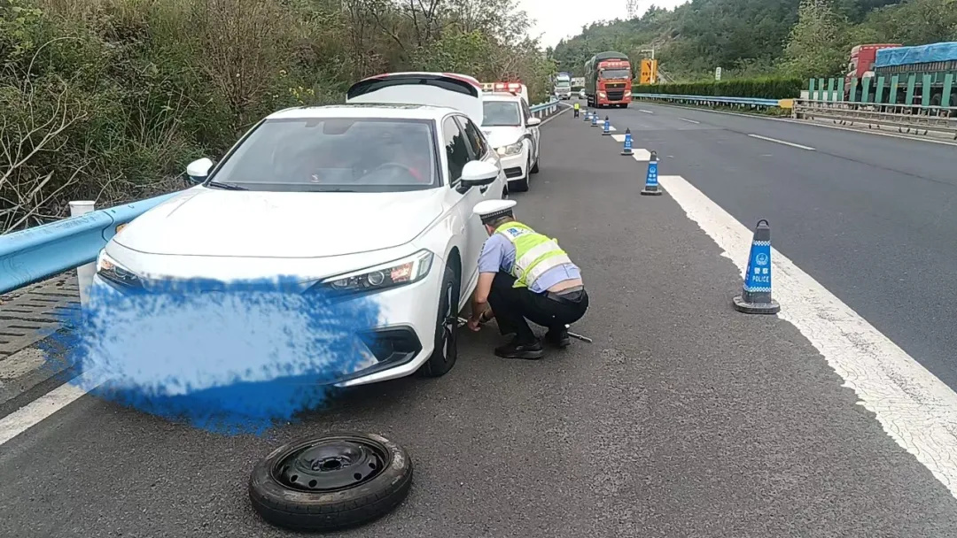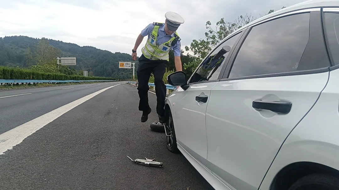 车辆爆胎民警忙救助10月2日13时许,文女士驾驶小客车准备前往茅台机场接朋友,行驶至蓉遵高速上行428公里路段时,小客车左前轮胎突然爆胎,车辆无法继续行驶。文女士当时不知道如何处置,万分焦急。此时,遵义市公安交通管理局高速交警四大队三中队巡逻组民警罗曦、辅警蒲青飞驾驶警车巡逻经过此处,他们立即停车上前询问。初步了解情况后,民警迅速在文女士的车后设置警戒反光锥筒,同时帮忙从其车上取下备胎,十多分钟后,帮忙换好了备胎。民警提醒文女士,备胎不可久用,应尽快找地方更换或者修补轮胎,还提醒她及时检查车况,做好保养和安全检查。