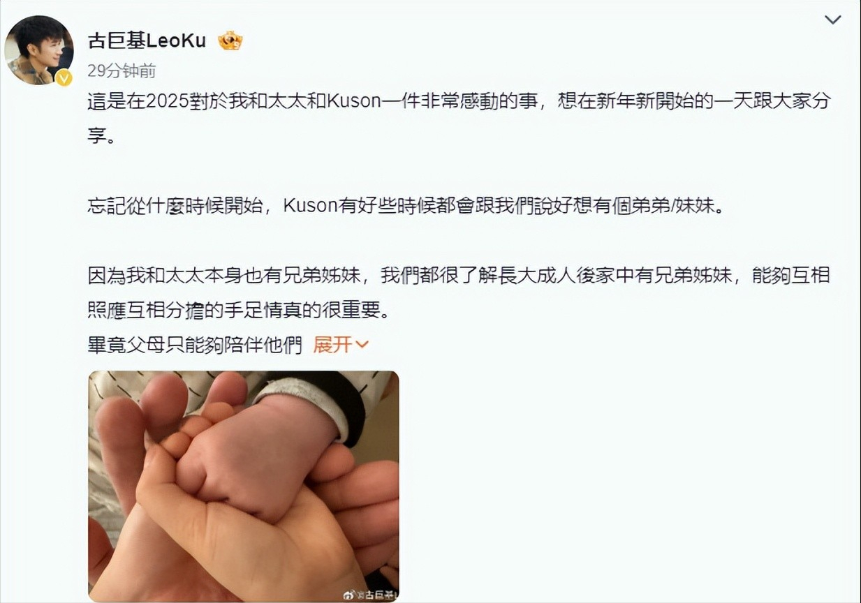 本以为这就是“终极惊喜”,没想到2026年元旦,古巨基又晒出了二胎的照片。