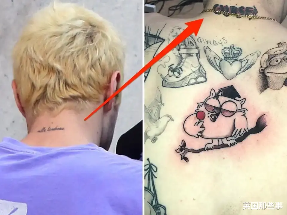 为了配合A妹在14年纹的纹身,他也在脖子后面纹了法语短语“mille tendresse” ——一千个温柔,出自A妹最喜欢的电影《蒂凡尼的早餐》。