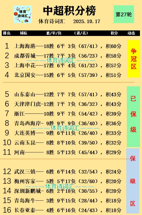 中超第27轮属于强弱大战,争冠与保级球队迎来三场直接对决,都需要三分提升成绩。上海海港率先出战,4-3险胜青岛海牛,继续领跑;成都蓉城随后出场,3-1拿下梅州客家,持续施压榜首。积分榜第三的上海申花在客场面对青岛西海岸,在11打9的情况下,依靠玄冥二老(吴曦、于汉超)的进球,最终以2-1结束成功收获3分,保留争冠希望。