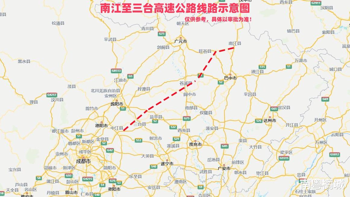 根据规划,南江至三台(中江)高速公路项目起于巴中市南江县林家塝,顺接G85银昆高速,经广元旺苍、苍溪,南充阆中、南部,绵阳盐亭、三台,止于德阳市中江县回龙镇,与成巴高速十字枢纽互通,全程约271公里,连接线38.9公里。其中,起点至阆中段约130公里设计时速80公里,阆中至止点约140公里升级至100公里,双向四车道,桥隧比高达46%,直接辐射川陕革命老区、秦巴山集中连片特困区,覆盖人口超600万。