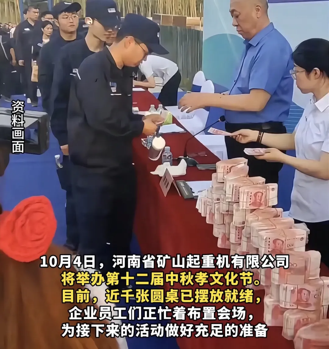 河南省矿山起重机有限公司创始人崔培军连续两天亲自向每位员工父母递上600元现金与一束鲜花,现场累计发放礼金超过1000万元。