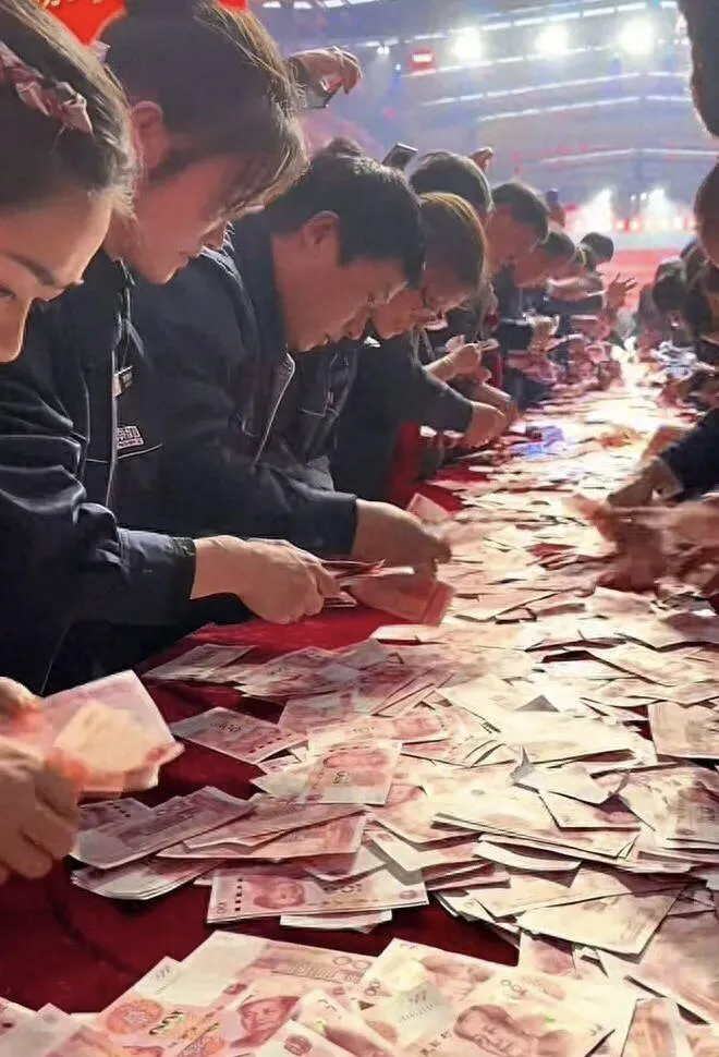 公司还举办了数钱比赛,在限定时间内,员工可以拿走数到的全部现金,该届比赛共发放了1200多万元。