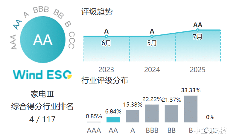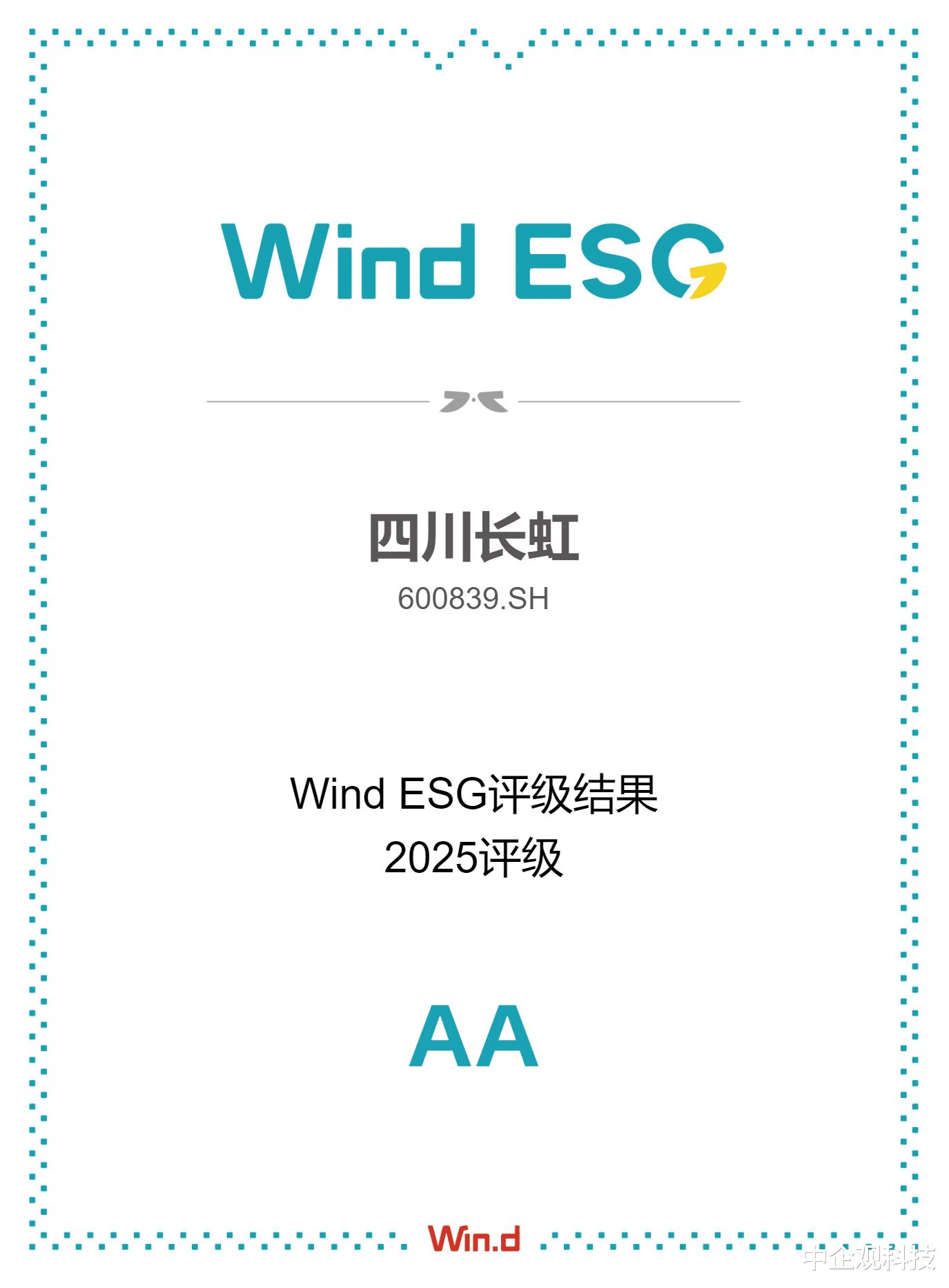 日前,国内权威ESG评级机构Wind(万得)发布2025年最新评级结果,四川长虹(股票代码:600839)凭借卓越的ESG表现,从A级提升至AA级,ESG综合得分升至8.56(10分制)。
