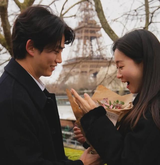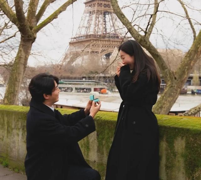 继续深挖下去,就看到了那令人心动不已的求婚画面。玉泽演身着黑色的大衣,站在浪漫无比的法国街头。那身黑色大衣穿在他身上仿佛有一种独特的魔力,既带着低调的奢华,又有一种神秘的深邃感。他手里捧着一束娇艳的花,那束花像是在诉说着即将开启的幸福篇章。他的女友同样穿着黑色大衣,宛如从童话中走出的公主,她娇羞地低下了头,那模样就如同月下含苞待放的花朵,静静等待着属于她的甜蜜时刻。在这一片充满浪漫气息的法国城市街头,玉泽演突然单膝跪地,这个画面就像电影中的经典场景一般。他缓缓掏出戒指,动作轻柔又坚定,眼神中满是深情。女方听到求婚的那一刻,先是一惊,然后脸上瞬间被惊喜和感动填满。她捂着嘴巴的画面十分可爱,那模样就像是一个即将被幸福淹没的小精灵,激动得好似下一秒就要落泪一般。这一刻,仿佛整个巴黎的阳光都聚焦在他们身上,为他们的爱情增添了一抹绚烂的光彩。