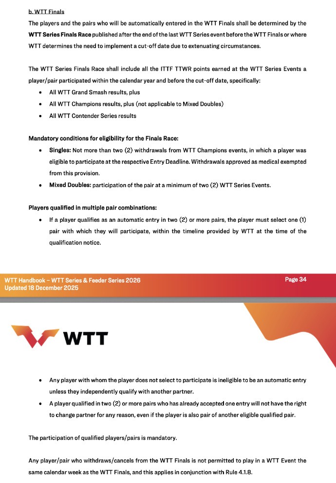 而对于退赛这件事,WTT也发生了改变,要求在冠军赛中球员在相应的报名截止日前符合参赛资格时最多只能退赛2次。因医疗原因获准退赛的球员不受此限制。