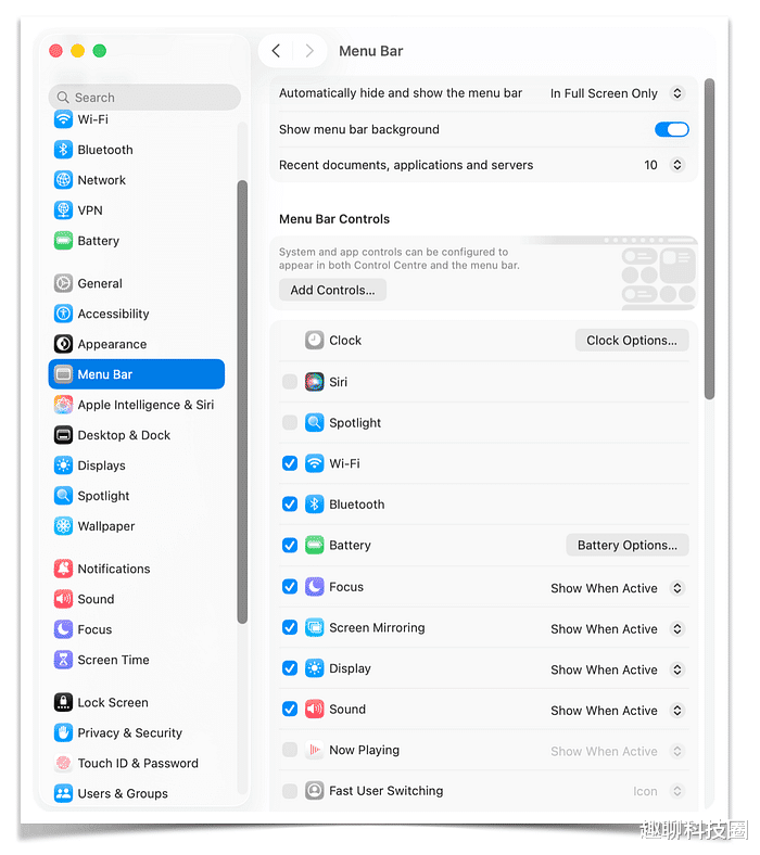 3️⃣ 自定义菜单栏,很多新手会忽略顶部的菜单栏,但菜单栏其实能变得很有用,在系统设置里找到“控制中心”,你可以决定哪些控制项出现在菜单栏里,我一般把“自动隐藏菜单栏”设置为“仅在全屏时”,这样既干净又不完全藏起来,macOS 的控制中心和菜单栏现在关系更紧密了,你还能直接把控制中心的项目拖到菜单栏里,想移除就按住 ⌘ 拖下来就行,这些操作学会了会舒服很多;