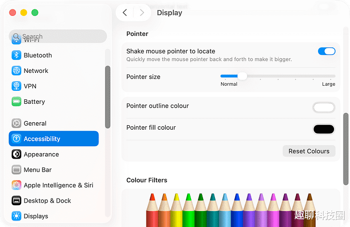 9️⃣ 改变指针大小,指针的大小也能在系统设置 → 辅助功能 → 显示 → 指针里调,把滑块往右移一点,指针会更容易找到,也能改颜色,但我还是习惯黑白经典配色,这个设置对视力不太好的朋友特别有用;