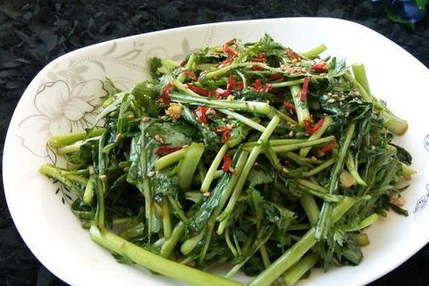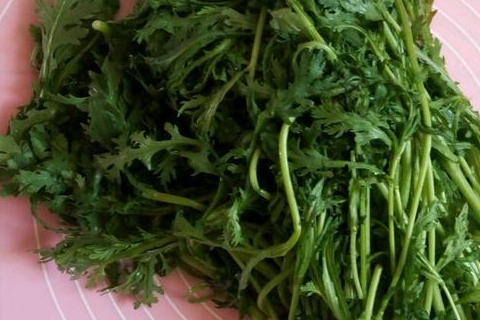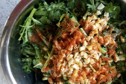 5.油热后大料粒挑出来丢弃,把油浇在放好调料的茼蒿菜盆里
