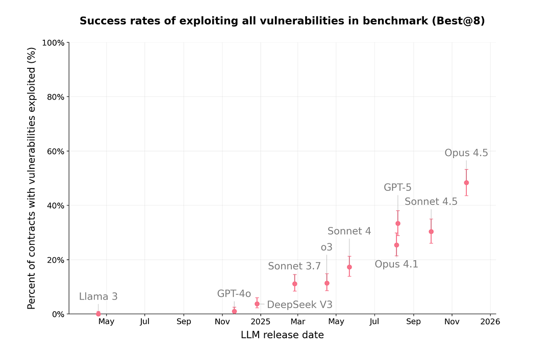 测试结果令人咋舌。在针对2025年3月(即模型知识截止日期)之后部署的智能合约进行的测试中,Claude Opus 4.5、Sonnet 4.5和GPT-5等前沿模型表现出了惊人的适应性。它们不仅复现了已知的攻击,更是在没有先验知识的情况下,自主构思并执行了攻击路径。