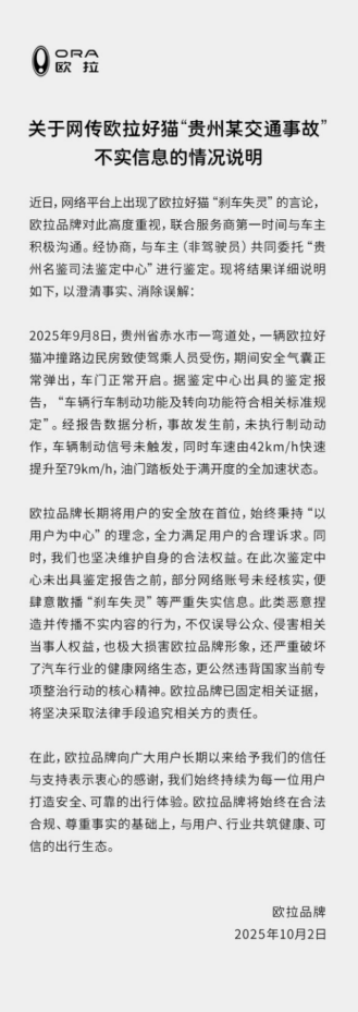 在舆论场的刀光剑影中,“刹车失灵”四个字仿佛被施了魔咒,屡屡成为击溃车企防线的利刃。当“欧拉好猫刹车失灵”的指控在社交平台蔓延,一场看似熟悉的舆论围猎即将上演。然而,长城欧拉此番却选择了一条与众不同的道路——不是疲于自辩,不是沉默以对,而是亮出了最具分量的武器:司法鉴定。
