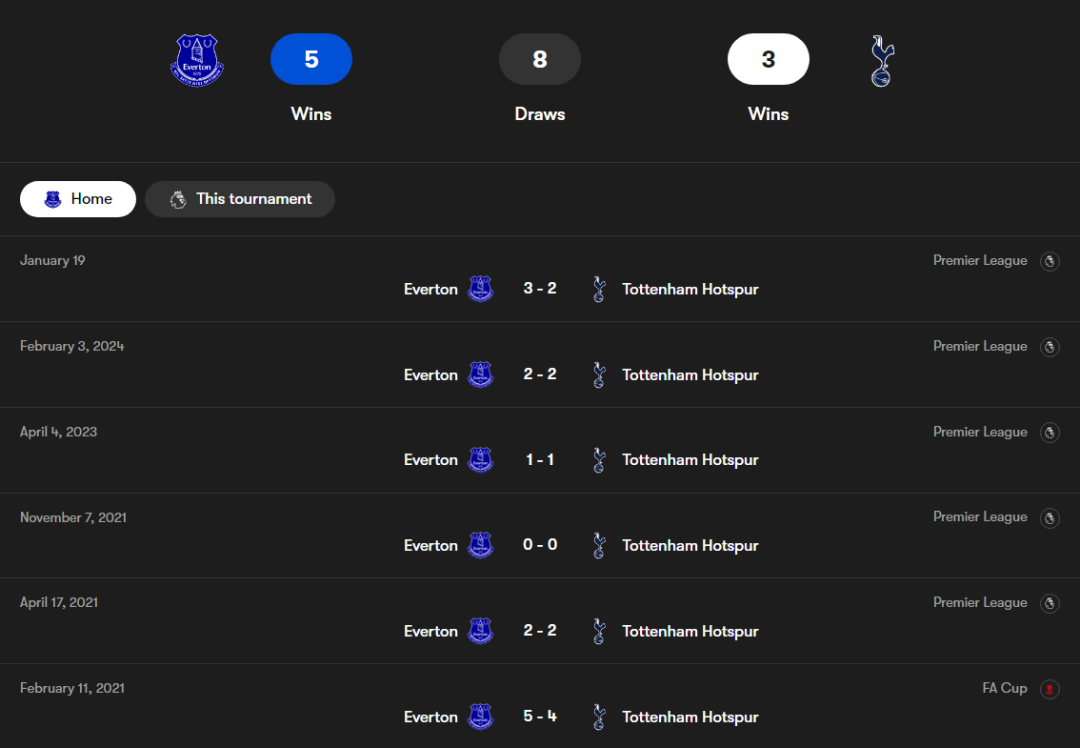 从历史交锋来看,热刺曾创下联赛11次客场不败埃弗顿的纪录,但近期交锋格局已发生反转——今年1月的对决中,埃弗顿曾在主场3-2力克热刺,打破了此前的交锋颓势,而且埃弗顿主场近6战热刺,有多达5场平局,主场势均力敌的交锋情况,也会为球队带来不小的底气。