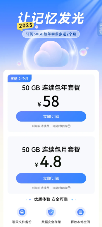 如果你也想和我一样想给美好回忆找个安稳的家,“华为云空间2025让记忆发光”活动千万别错过,订阅50GB连续包年套餐只要58元,还多送2个月,日常存照片、视频完全够用。新的一年,不管是生活的日常点滴、还是旅行中的美好瞬间,云空间都可以帮你自动保存,通过自动同步、释放空间、跨端调用这些实用功能,让回忆一直发光~