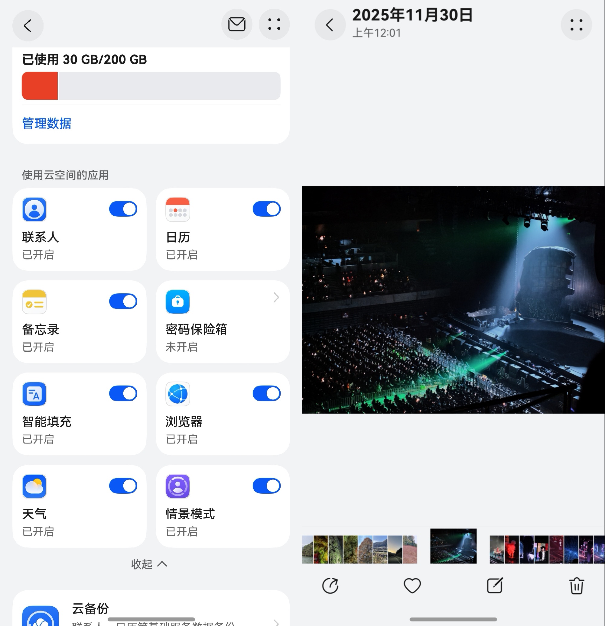 第一个“青春热血奖”,必须是要颁给期待了很久的演唱会。现场跟着偶像合唱时,手机举得比谁都高,拍了一些高清视频和上百张照片。打开云图库功能后,这些高清版本的照片和视频都会同步到云端,哪怕设备丢失、损坏了也不怕美好的记忆丢失。而且同步打开“优化设备存储空间”功能后,系统还能智能地帮我把不常用的照片视频替换为预览版本,释放本地存储空间。
