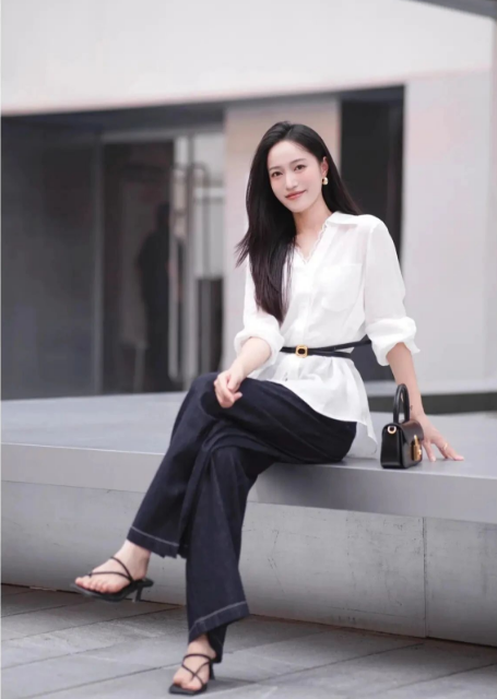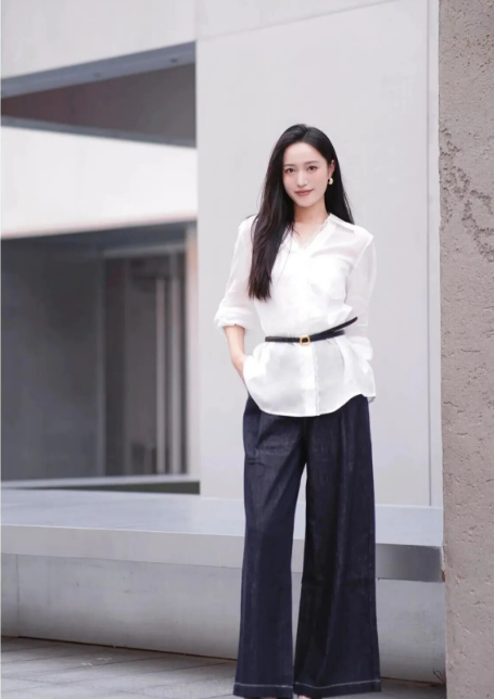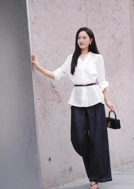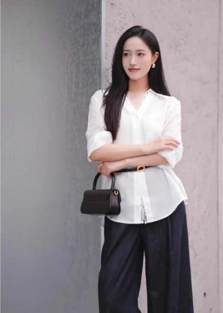 轻熟风穿搭:白色衬衫搭配深蓝色阔腿裤,轻松打造高级氛围感