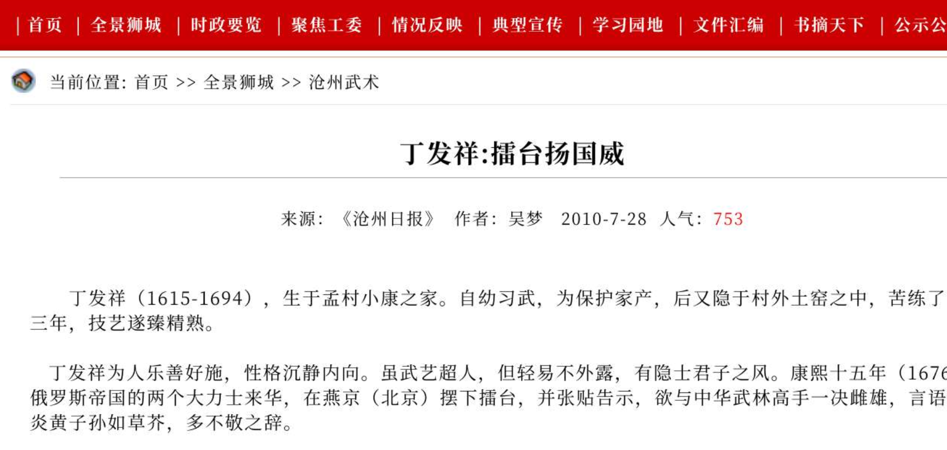 【2】《八极拳精要》、《沧县志》等典籍记载,“丁发祥,字瑞羽,生于明万历四十三年(1615年)”.