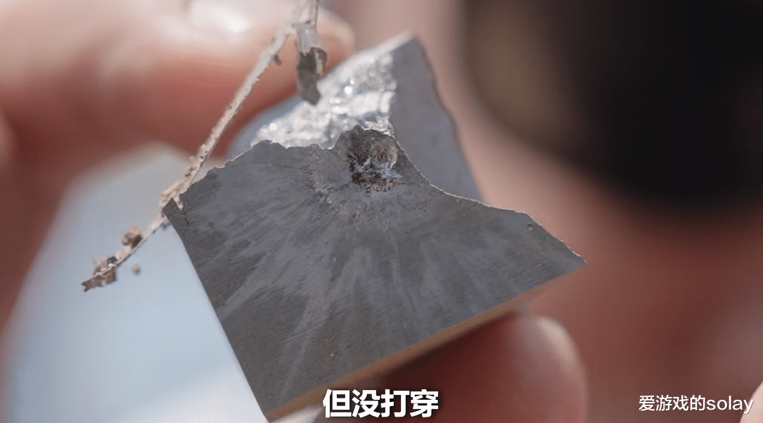 为了更好地测试材料的硬度,老李又用AK来打钨镍合金,在子弹强大的冲击力下,钨镍合金竟然碎了,但是它背后的纸没被射穿,而且钨镍合金只是被震碎了,子弹并没有打穿,可见其硬度惊人!