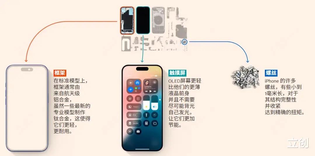 核心的OLED 显示屏和集成多点触控层由韩国三星生产;中框铝材和螺丝几乎都来自中国和印度。
