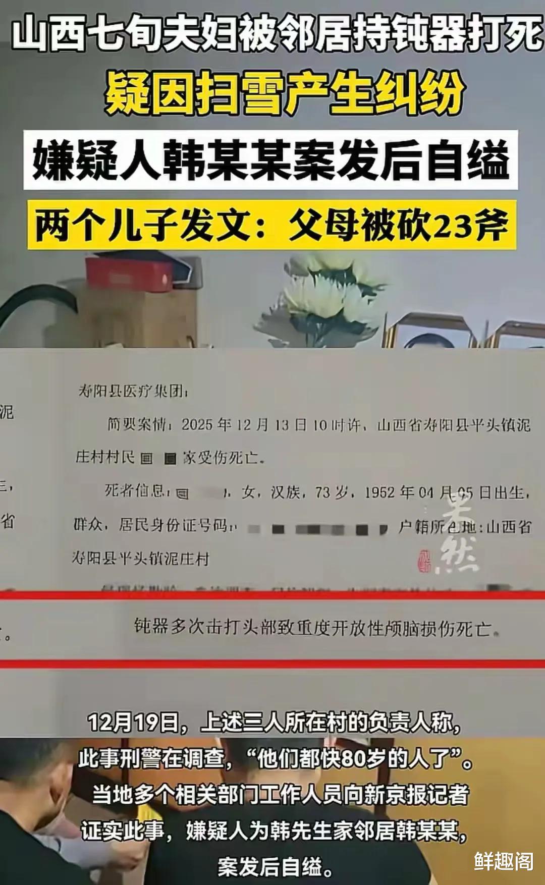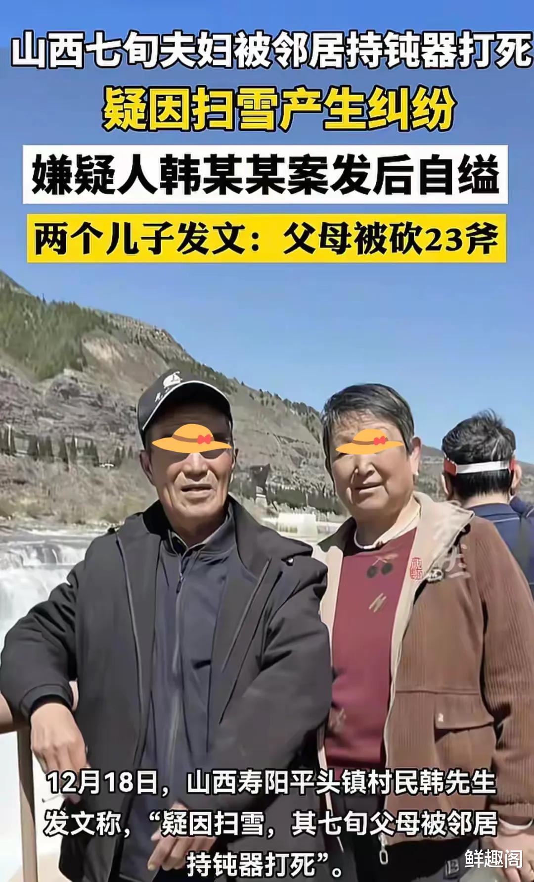 山西寿阳县平头镇的一起邻里纠纷,让一对七旬夫妇的生命永远停在了这个冬天,而行凶的邻居在案发后选择了自杀,令人唏嘘不已。2025年12月20日,有多家媒体曝光了这起悲剧事件。据了解,这件事情发生在山西省晋中市寿阳县平头镇,时间是2025年12月18日。