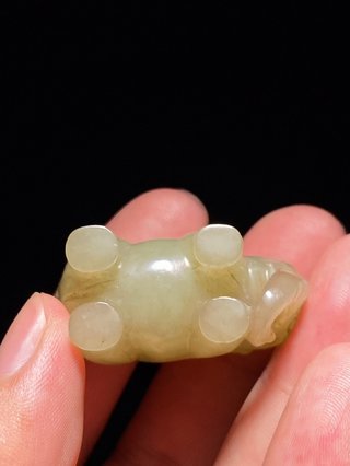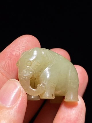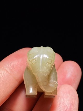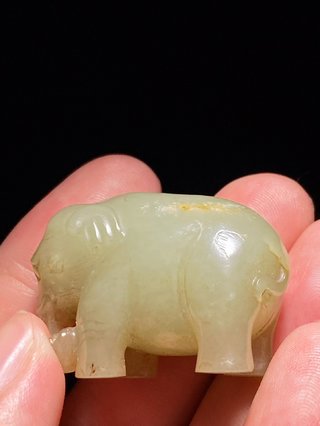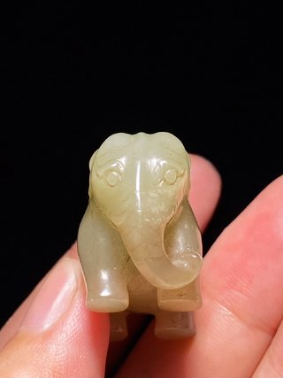 明以前 和田玉籽料 白玉 玉象 大象 把件 摆件 长3.9厘米 宽1.8厘米 高2.6厘米 重30.9克 和阗白玉为材,局部带黄褐沁色,圆雕一大象,玉象呈站立姿态,体态丰硕,四肢强壮如柱,大耳长鼻,嘴半张开,表情温驯憨实。象以其力大魁威,令百兽畏惧,却同时性灵柔顺,与人为善,自古即被人奉为瑞兽,蕴含“太平有象”的吉祥寓意,意谓天下得治、和平久安。