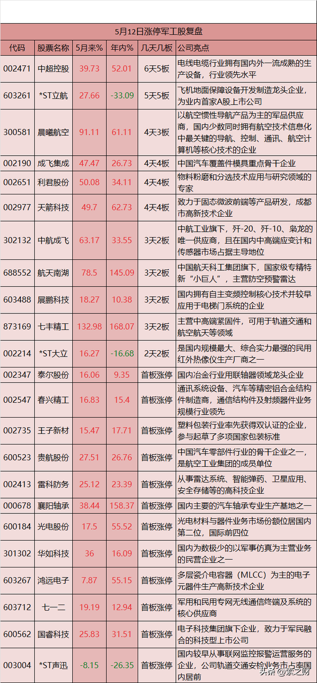 其中,七丰精工5月来涨幅超130%,航天南湖年内涨幅145%,晨曦航空单月涨91%。中超控股6天5板,*ST立航5天5板。军工产业链个股全面大爆发,喜迎大丰收。