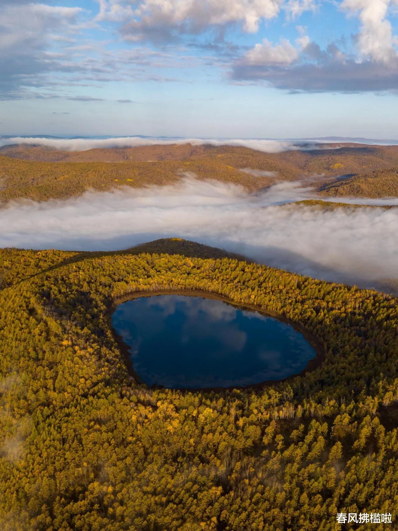 月亮天池是世界唯一与月亮天地重合的火山湖,圆形湖面如明月落入凡间周围金桦林环绕,湖水碧蓝如镜,秋日云雾缭绕,如仙境般梦幻。