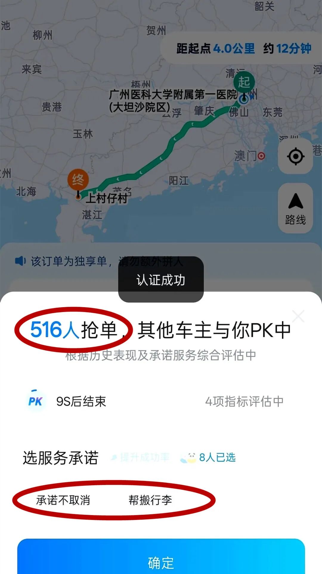 抢单页面的实时数据看得人手心冒汗:离 PK 结束还剩 9 秒时,已有 516 人挤在里头争;为了提高成功率,不少车主直接甩出 “不取消订单”“帮搬行李” 的承诺,恨不得把能想到的服务都打包上;等到最后 6 秒,抢单人数又飙到了 530 人 —— 很难想象,那最后几秒里,有多少车主紧盯着屏幕,手指悬在抢单键上不敢挪。