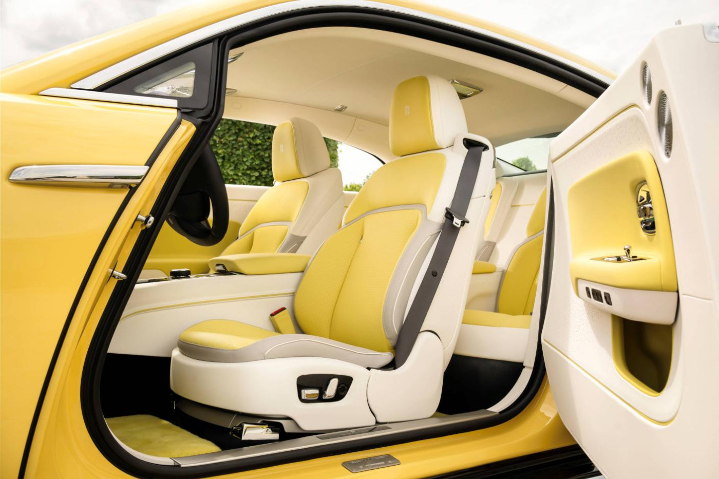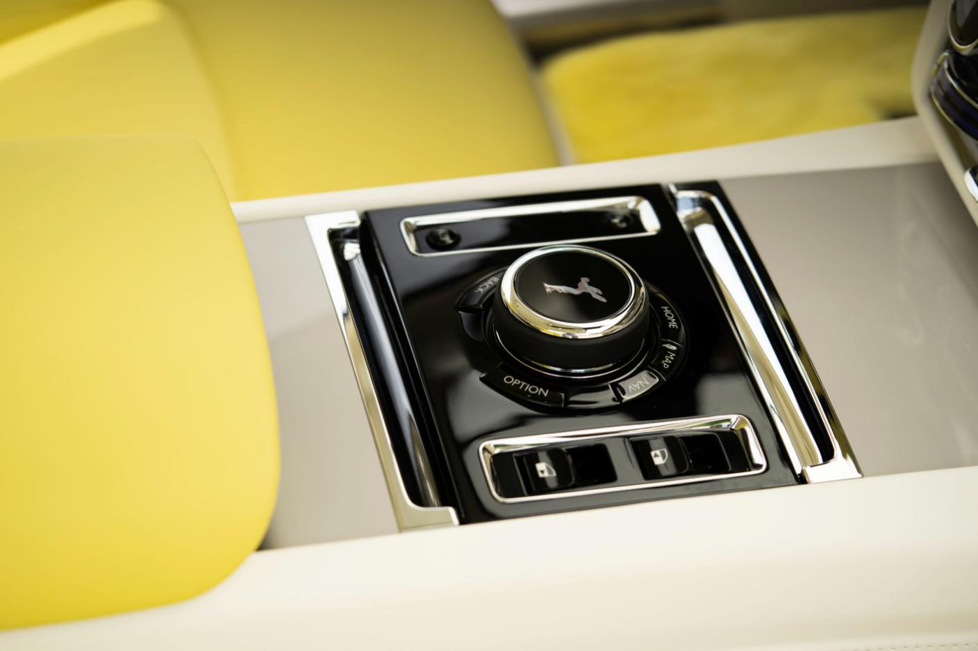 鲜明亮丽的黄色调也延展至内饰中。车内座椅、星光车门及仪表板上部饰板均运用了Bespoke高级定制柠檬黄(Lemon Yellow)与黄晶石(Citrine Yellow)配色。柠檬黄色缝线与内饰中的优雅白(Grace White)及岩板灰(Slate Grey)色调搭配,营造出鲜明的撞色风格。劳斯莱斯设计团队充分运用了SPIRIT“奢华数字架构”带来的数字化Bespoke高级定制能力,赋予仪表盘与车色相呼应的黄色配色方案。