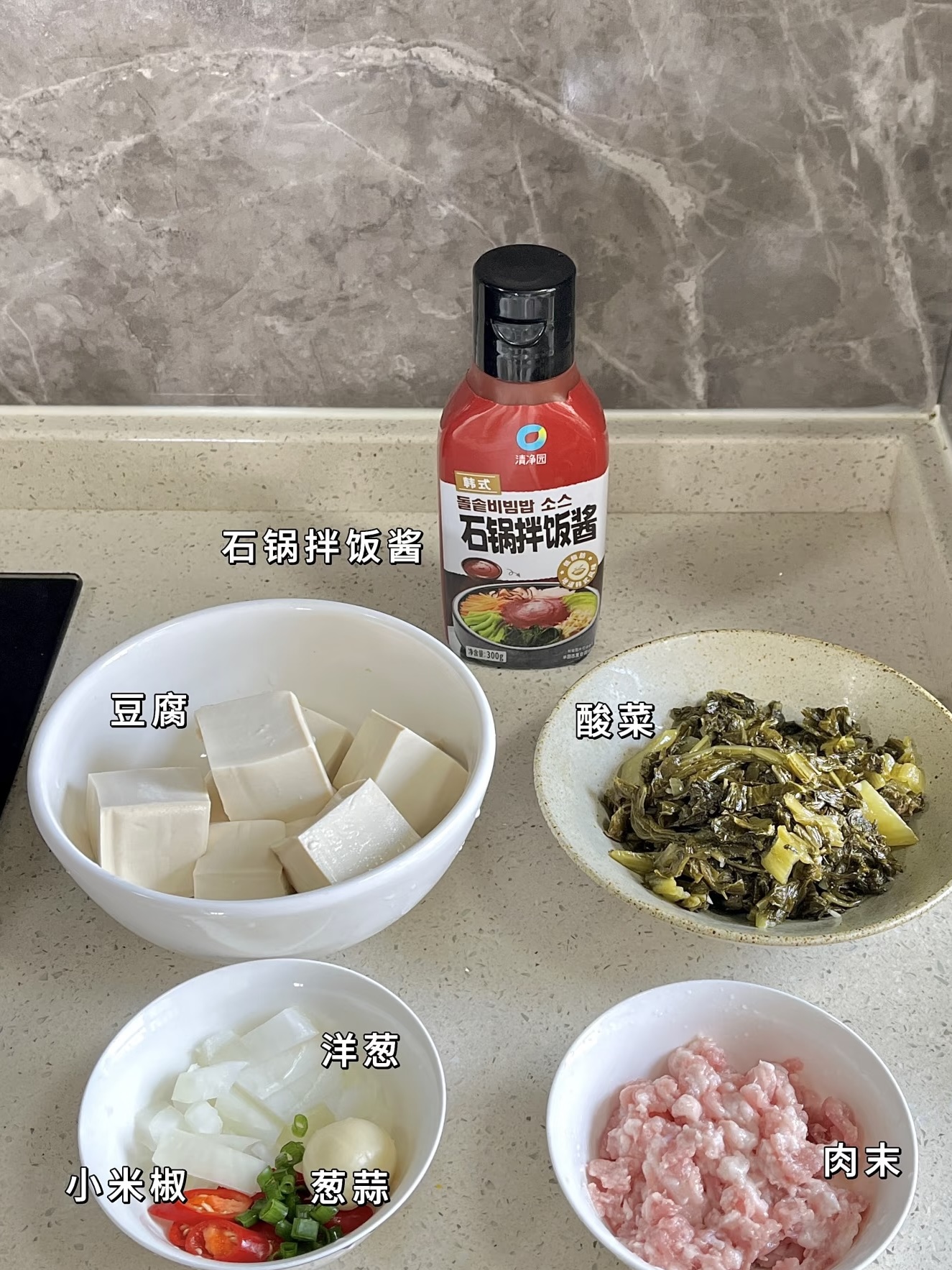先给主角们办个“见面会”:老豆腐一块,别太嫩,否则一煮就散;酸菜抓一把,要是带梗的更好,脆生;猪肉末两三勺,肥瘦三七开,香而不柴;洋葱四分之一个,增甜;大蒜三瓣、小米椒两根,提味又提色。秘密武器是“韩式石锅拌饭酱”,一勺子就把整锅的魂勾出来,没有的话用豆瓣酱也行,但香味会少点“韩剧滤镜”。