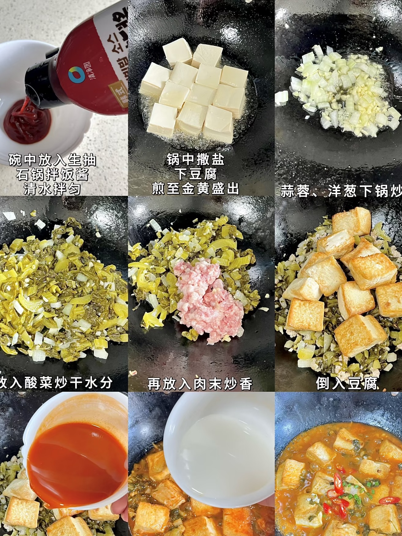 把整锅倒入小砂锅,盖上盖,中火咕嘟5分钟,让豆腐在酸汤里“泡桑拿”,毛孔全开,吸饱汤汁。最后撒一把葱花,绿得跳脱,关火端桌。砂锅保温逆天,十分钟过去还冒泡,舀一勺,豆腐外韧内嫩,咬开“噗呲”飙汁,酸菜脆得“咔嚓”,肉末香得“打转”,汤汁酸辣开胃,泡饭能吃三碗。