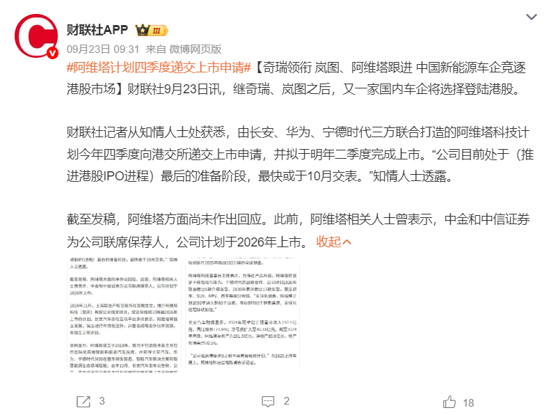 据悉,此前,阿维塔相关人士曾透露,公司计划于2026年上市。综合市场消息,阿维塔赴港IPO的钟声或已渐近。